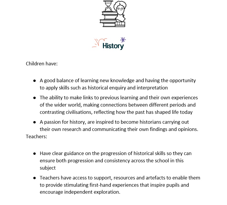 - have developed their enquiry skills with a chronological knowledge and understanding of British, local and world history