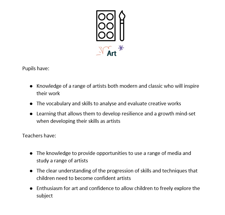 We are dedicated to providing an inclusive Art & Design curriculum that values every child as an artist as part of our broad curriculum. We aim to engage and inspire pupils with both visual and tactile experiences while providing opportunities to express their own thoughts and ideas in a variety of media. Our Art & Design curriculum balances knowledge and skills while fostering a love of Art & Design through curiosity and creativity. By exploring a diverse range of artists, materials and processes, children enhance their understanding of different cultures and time periods. The skills, communication and enjoyment we develop through the Art and Design curriculum enriches our lives, develops critical thinkers and helps us to understand the world.