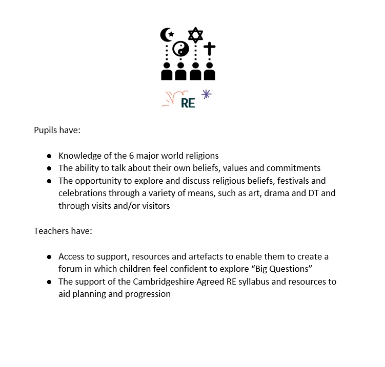 Through their RE learning, we want children to be able to make links between their own lives and those of others in their community and in the wider world, recognising the diversity which exists and accepting the differences and valuing the views and traditions of our multicultural society. We also want children to treat all religious and non-religious beliefs or world views with respect and to prepare them for adult life, relationships with others, employment and life-long learning.